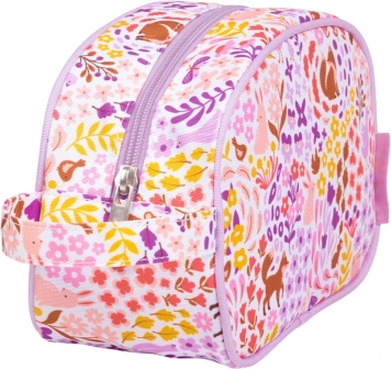Nyd en praktisk lyse lilla toilettaske med unikt dyreprint i den blomstrede have.