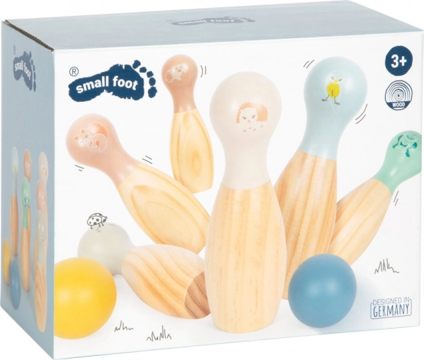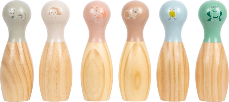 Oplev glæden ved at spille med dette farverige sæt trækegler fra Small Foot! Sættet indeholder kegler med søde motiver af egern, pindsvin, blåmejse, kanin, mus og frø.