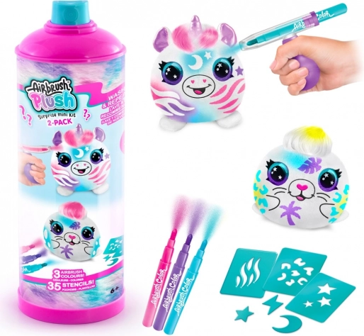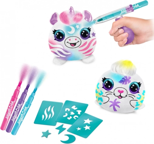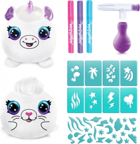 Det sjove og kreative sæt kommer med et airbrush-værktøj og tre tuscher, som giver uendelige designmuligheder. I pakken finder du to overraskelses-plysdyr på 10 cm, som du kan dekorere efter din fantasi ved hjælp af de medfølgende skabeloner. Serien tilbyder i alt 6 typer plysdyr, så hver pakke er unik!