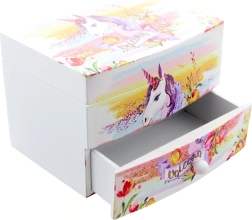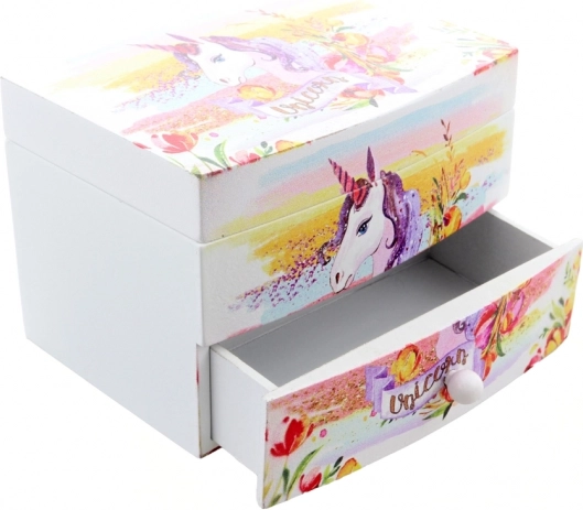 Træsmykkeskrin med enhjørningemotiv, som ikke kun er et stilfuldt element til børneværelset, men også en praktisk opbevaring til små skatte. Det er den perfekte gave til børn, der vil glæde med sin magi.