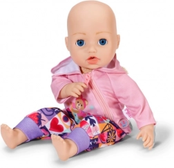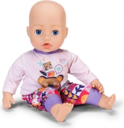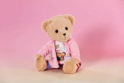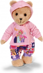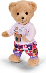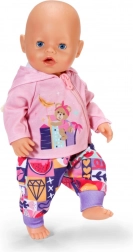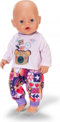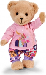 Med dette tøj sæt får både dukken og BABY born Teddy komfort og stil til alle eventyr. Den lyserøde hættetrøje med lynlås og søde ører er nem at tage på, den lyslilla langærmede T-shirt med bamse er superblød, og bukserne med farverigt patchworkmønster giver masser af komfort under legen.