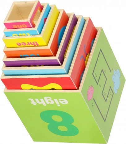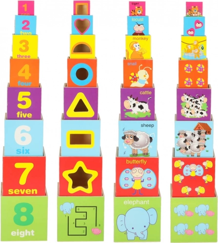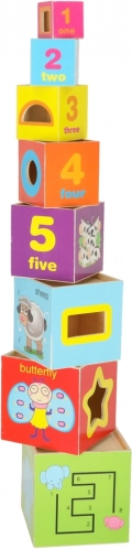 Dette sæt indeholder 8 farverige træklodser, der kan stables til et tårn op til 71 cm højt! Hver klods har 8 aktive læringssider, som tilbyder forskellige muligheder for leg og læring.