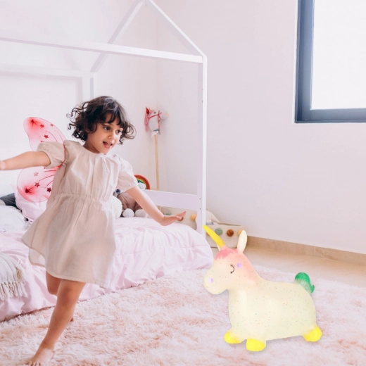 Vælg det bedste legetøj til at udvikle dit barns koordination og motorik! Hoppelegetøjet formet som en magisk enhjørning giver timevis af sjov og bevægelse for små eventyrere – ideelt til både indendørs og udendørs leg.