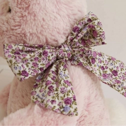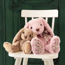 Den sarte rosa farve og blomsterdetaljer på ørerne og poterne gør kaninen til en smuk dekoration.