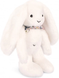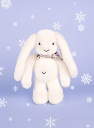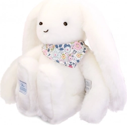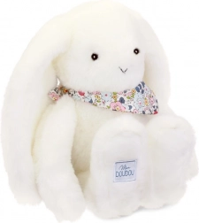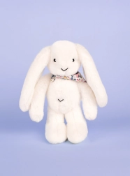Blød hvid kanin med blomstret tørklæde er den ideelle ledsager til en baby fra fødslen. Dens blødhed og fine tekstur giver en følelse af komfort og tryghed.