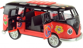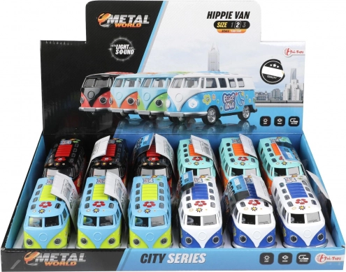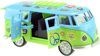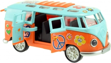 Oplev en miniature-retrobus, der fanger blikket med sit farverige “hippie”-look og imponerer med effekter, når den sættes i gang. Træk den blot tilbage og slip – friløb sørger for en frisk fart, mens lys og motord lyd fuldender oplevelsen.