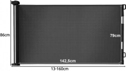 Praktisk udtrækkelig sikkerhedslåge med net beskytter både børn og kæledyr mod farlige zoner i hjemmet. Den er let at betjene, pladsbesparende og passer ind i enhver indretning takket være det sorte design. Udtrækkelig op til 160 cm, højde 86 cm, holdbart PVC-net og robuste metal- og plastkomponenter sikrer en pålidelig barriere ved døre, i gange og ved trapper.