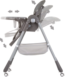 For ekstra sjov medfølger også en aktivitetsbøjle med legetøj. Højstolen er let at flytte takket være 4 hjul og kan opbevares kompakt. Det moderne design og den nemme håndtering gør den til et fremragende valg til daglig brug.