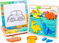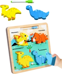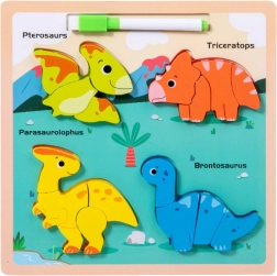 Denne træpuzzle til læring med dinosaurmotiver tilbyder en unik kombination af underholdning og læring. På den farverige plade finder du fire yndige dinosaurer – Pterosaur, Triceratops, Parasaurolophus og Brontosaurus. Hver af disse dinosaurer består af flere dele, som barnet placerer de rigtige steder, hvilket hjælper med at lære at genkende former, farver og navne på forhistoriske skabninger.