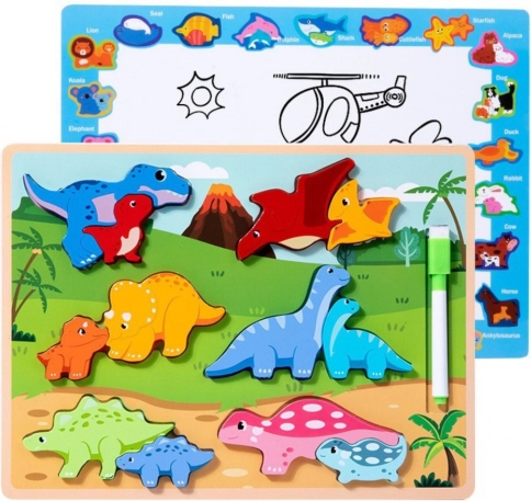 Træ 2-i-1 puzzle med dinosaurer og tegnetavle, der understøtter logik og kreativitet.