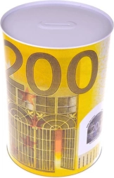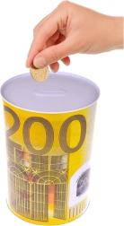 Denne effektive metalkasse i dåseform er trykt med en 200 euro-seddel. Perfekt til alle, der vil spare op med glæde og stil. Takket være den realistiske grafik med markante detaljer og den robuste, cylindriske konstruktion opfylder den ikke kun en praktisk funktion, men også en æstetisk – den kan være et dekorativt element på bordet, hylden eller kommoden. Fremstillet af slidstærkt metal, hvilket sikrer modstand mod daglig brug, små stød og mekaniske skader og bidrager til dens lange levetid.