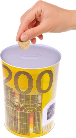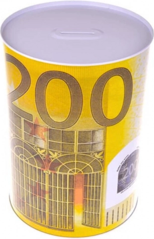 Metalkasse i form af dåse med motiv af 200 euro-seddel