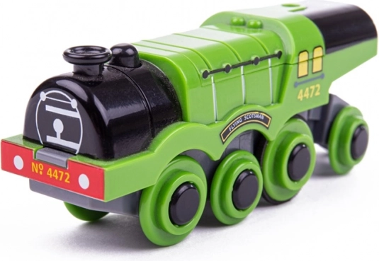 Ikonisk replika af damplokomotivet FLYING SCOTSMAN til trætogbaner glæder med stærk trækkraft, automatisk kørsel fremad og nem betjening med én knap. Takket være magnetsystemet kan den trække flere vogne, er kompatibel med de fleste træbaner og udvikler børns fantasi og motorik.