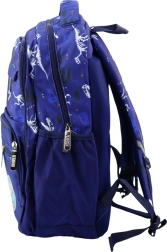Den blå skolerygsæk med dinosaurer og T-Rex-mærke tilbyder to rummelige rum. Hovedrummet har en skillevæg for nem organisering af bøger, hæfter og andet skolemateriel. Tre forreste lynlåslommer og elastiske sidelommer giver plads til flaske eller drikkedunk.