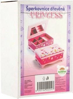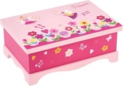 Dette lyserøde træ-smykkeskrin Princess kombinerer et magisk udseende med praktisk inddeling. Takket være spejlet på lågets inderside og de fem gennemtænkte rum hjælper det med at holde smykker og småting pænt organiseret. Den fine blomsterdekoration og teksten Princess skaber en eventyrlig atmosfære, der passer perfekt på børneværelset.
