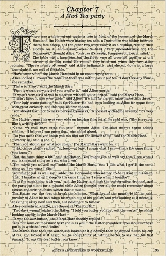 Dobbeltsides puslespil med en ikonisk scene og et uddrag fra bogen Alice i Eventyrland. Perfekt til elskere af puslespil og litterære klassikere.