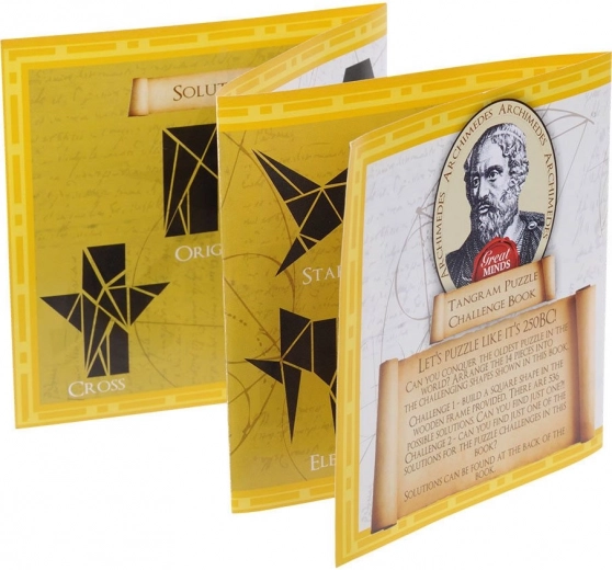 Vi præsenterer en udfordrende og underholdende gåde, der hylder Archimedes, en af de mest anerkendte tænkere fra oldtiden. Denne gåde indeholder 14 træbrikker, som du skal tage ud og derefter samle tilbage til et kvadrat. Den virkelige udfordring ligger i de utallige måder, brikkerne kan arrangeres på uden at blive drejet. Ifølge Archimedes’ oprindelige design har denne type gåde været kendt i mere end 2.000 år og betragtes som en af de ældste bevarede gåder. Ud over hovedopgaven kan du i den vedlagte brochure kaste dig over yderligere 12 formopgaver, der løfter din fantasi til næste niveau.