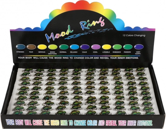 Ringen er let, komfortabel og fremstillet af holdbart metal med en glat overflade. Det termoaktive indlæg skaber iøjnefaldende, blanke og skiftende farver, som børn elsker. Pakningen med 100 stk er ideel til skoler, børnearrangementer, gaveposer, salgsbokse og som små præmier.