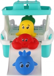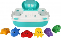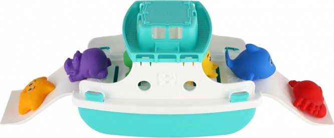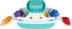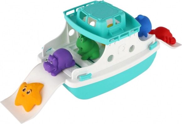 Denne badebåd til børn er designet til både leg og udvikling. Den flyder på vandet, har en nedklappelig rampe til lastning og losning af figurer og tilbyder god plads til leg på dækket. Medfølger gør bløde, farverige hav- og dyrefigurer, som børn kan køre, stable og lade glide ned ad rampen.