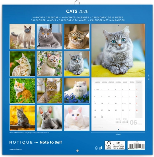 Vi præsenterer en fantastisk noteskalender for 2026, perfekt til alle katteentusiaster. Kalenderen har et seks-sproget kalendarium, som giver rigelig plads til alle dine noter og planer. Den gør det også nemt at orientere sig takket være inkluderede månefaser og vigtige helligdage. Med denne kalender har du alt, hvad du behøver for at organisere din tid: