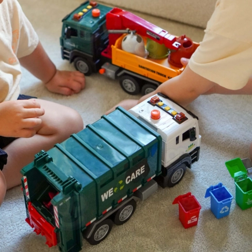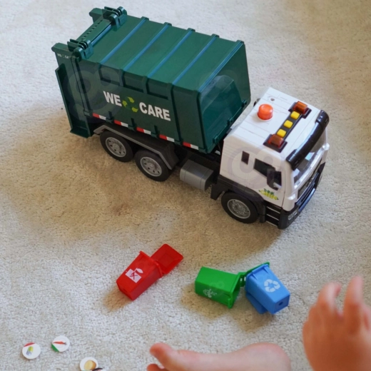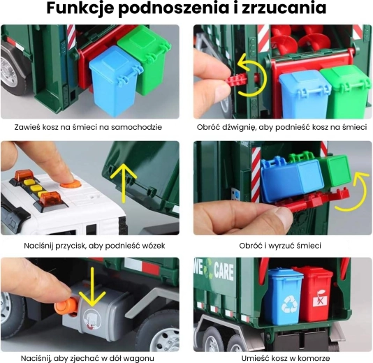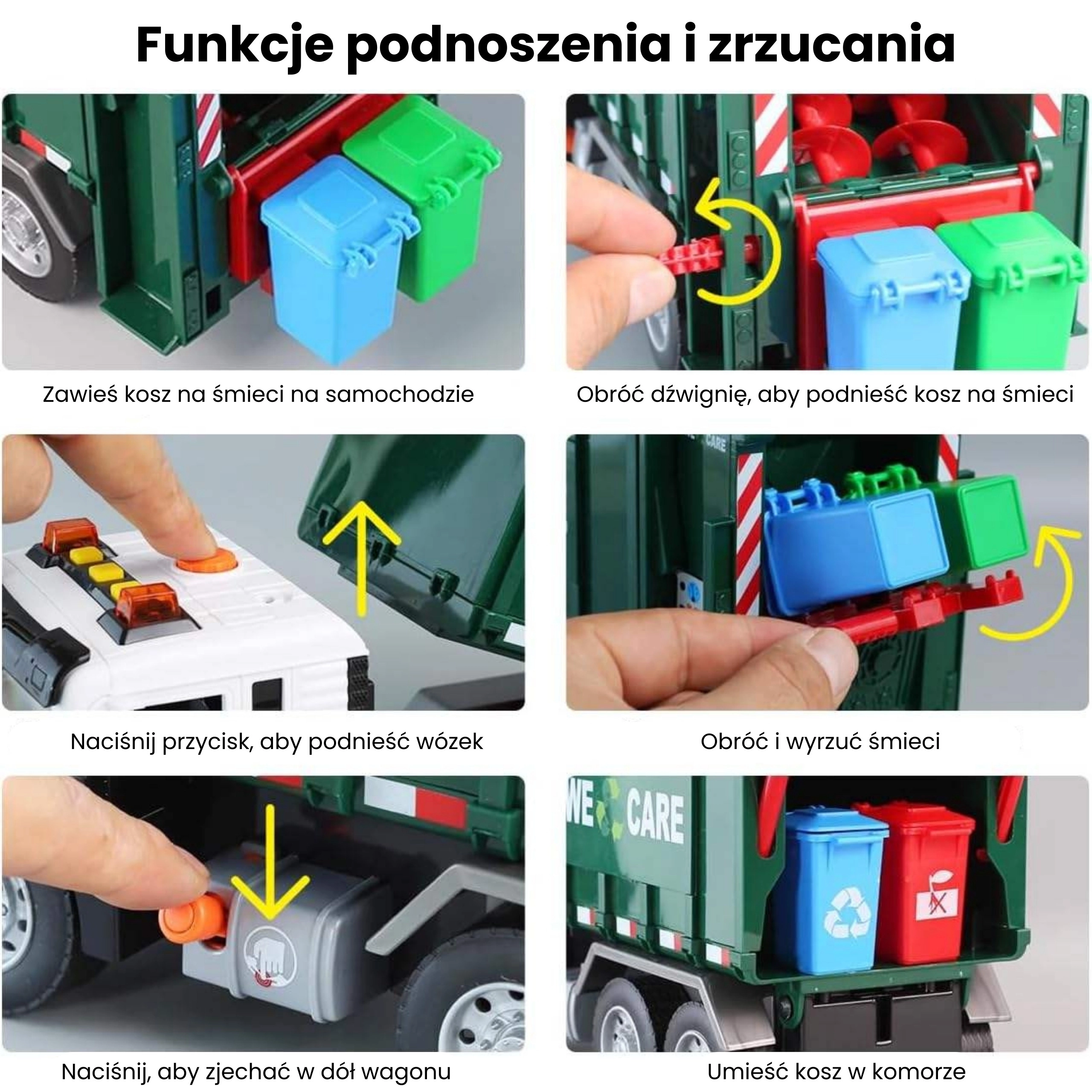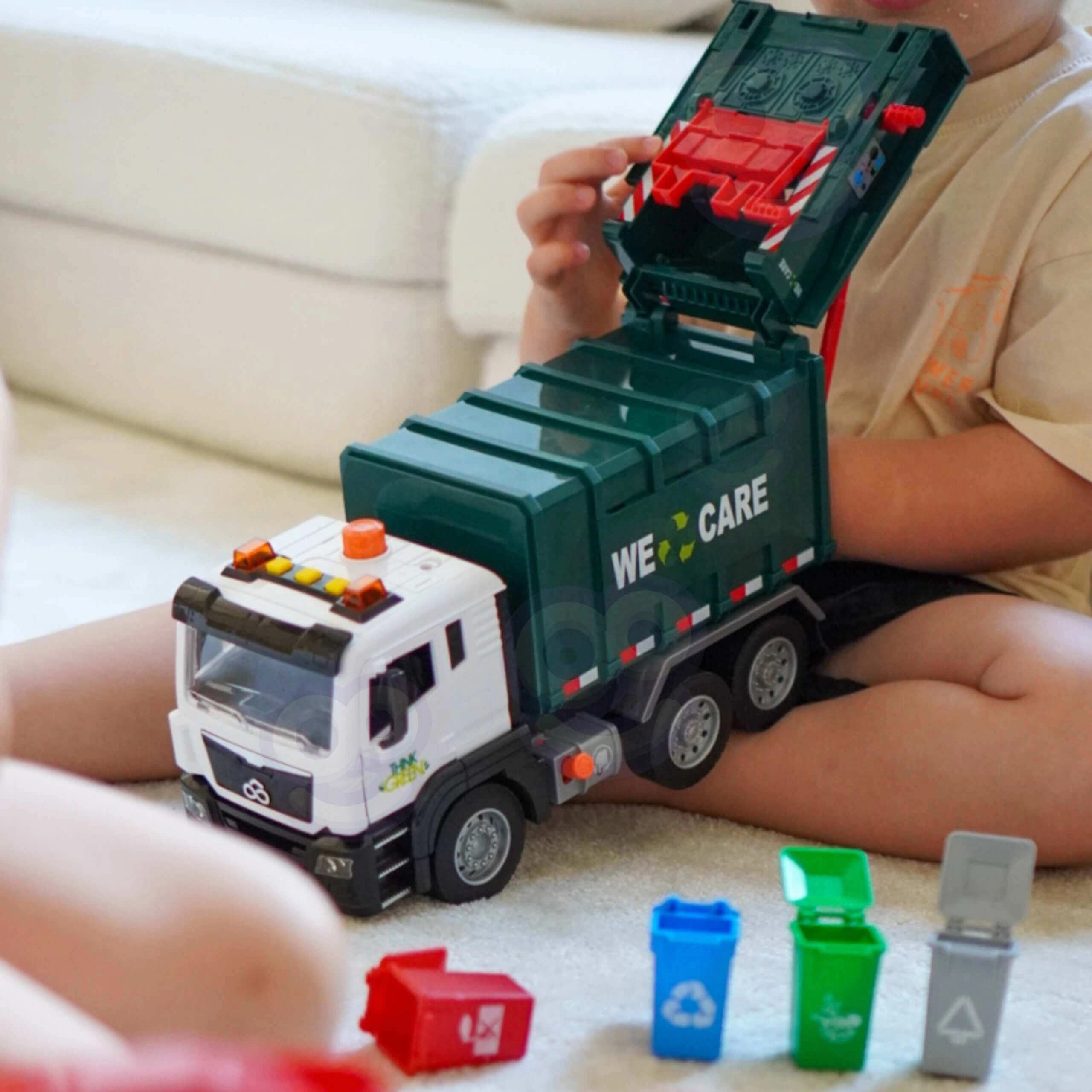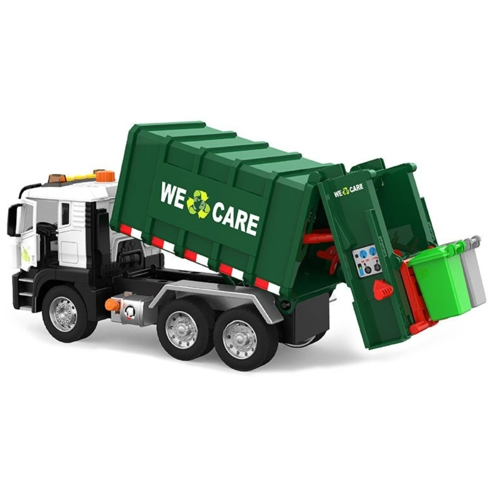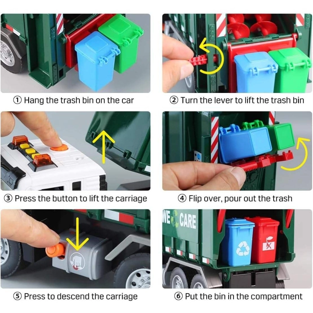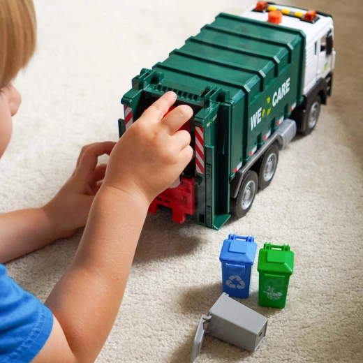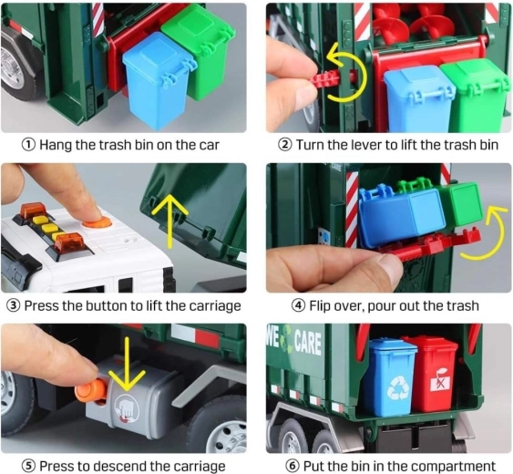 Løft den lille skraldespand, tøm indholdet i ladet, og åbn derefter bagklappen for at tømme. Den realistiske mekanik lærer børn principperne for affaldsindsamling.