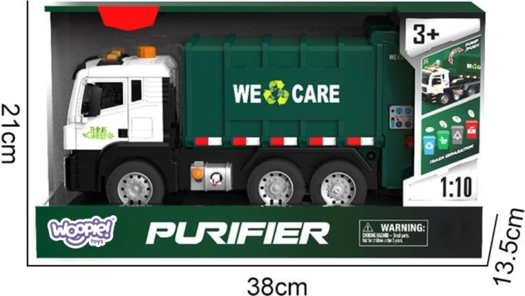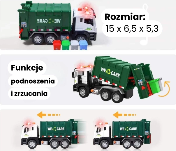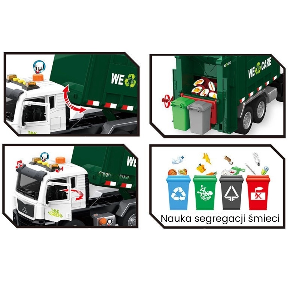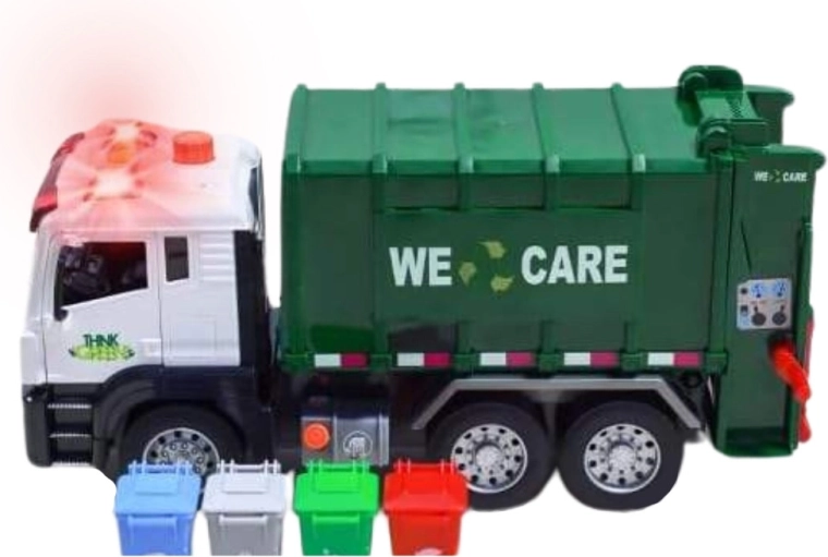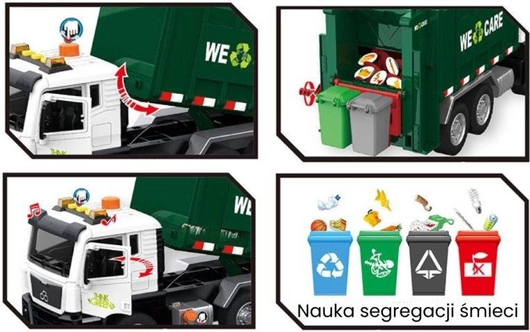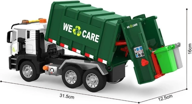 Den detaljerede skraldebil med teksten “WE CARE” giver børn en autentisk oplevelse af affaldsindsamling. Med et funktionelt løftearm, en åbnbar bagklap og medfølgende mini-spande kan børn afprøve realistiske procedurer for sortering og tømning af affald. Integrerede lys- og lydeffekter øger underholdningsværdien og stimulerer fantasien.