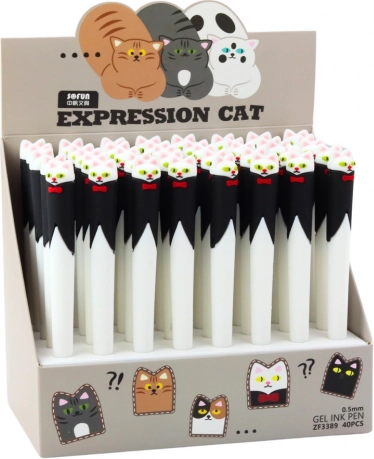 Sort-hvid gelpen med kat og blå blæk til jævn skrivning, velegnet til daglig brug.