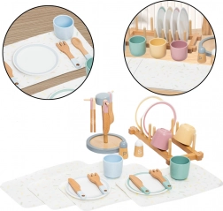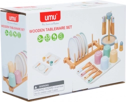 Med dette træ sæt service kan børn lege husholdning, restaurant eller arrangere teselskaber med venner. Hvert element er omhyggeligt fremstillet af kvalitets, sikkert og holdbart træ, som kan modstå intensiv brug. Der mangler ikke tallerkener, skåle, kopper, skeer, gafler, servietter, krydderier og et stativ til service.