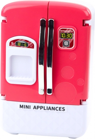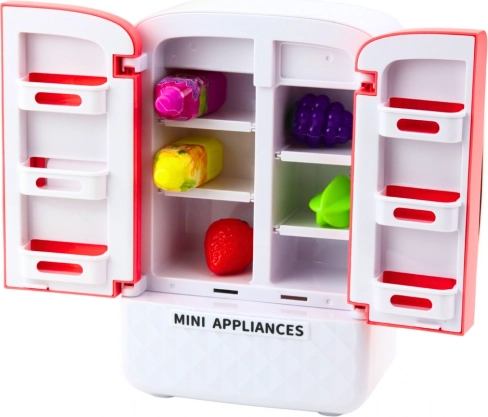 Køleskabet imponerer med sine innovative funktioner og muligheder. Det indeholder farverigt frugt, juiceflasker og hylder til fri indretning indeni, hvilket giver børn kreativ udvikling og lærerig organisering. Det er også ideelt til at simulere virkelige hverdagsscenarier.