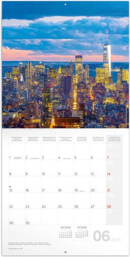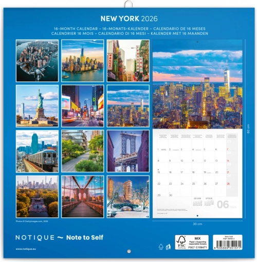 Nyd året 2026 med denne imponerende noteskalender med motiv af New York. Den indeholder tolv førsteklasses fotos af byen og er udstyret med et sekssproget kalendarium, som giver overblik over månens faser og vigtige helligdage.