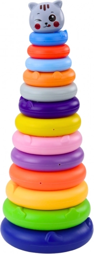 Legetøjet består af en bred, stabil base, en høj pind og 13 farvede ringe, som barnet stabler selv og dermed skaber et imponerende tårn. På toppen sidder en figur af en kær kat, som yderligere opmuntrer barnet til leg og udgør et attraktivt visuelt element.