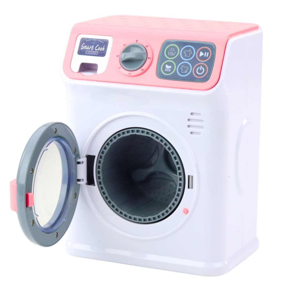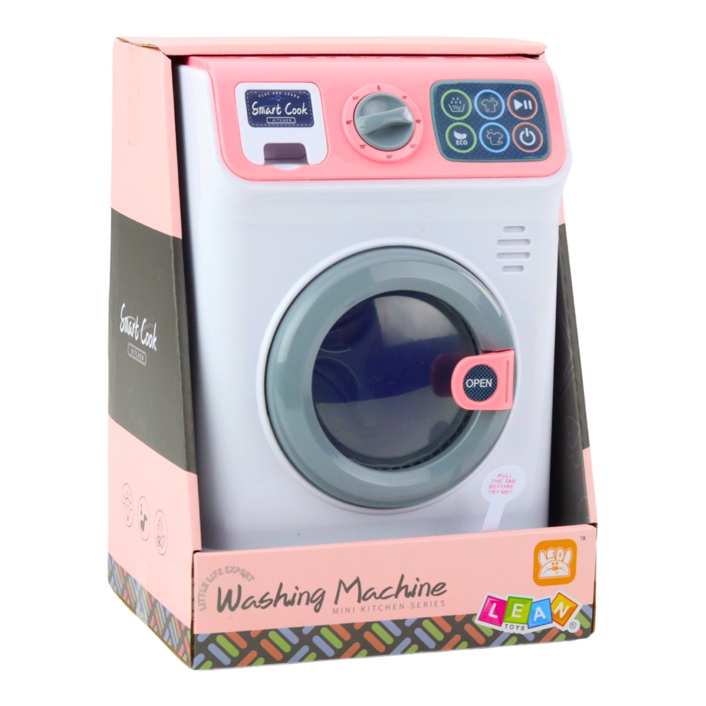 Børnevaskemaskinen startes med en ON/OFF knap på berøringspanelet. Vælg et af de tilgængelige programmer og maskinen begynder at arbejde - du hører lyden af vand der hældes i, og tromlen roterer, som om det var en rigtig vaskemaskine. En ekstra attraktion er den åbne fronttromle og den udtrækkelige skuffe til vaskemiddel for endnu mere realistisk leg.