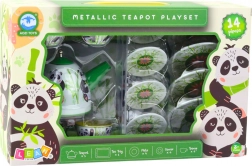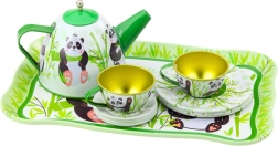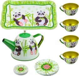 Børns metal tesæt med panda motiv er ideelt til små te fest elskere. I pakken finder du en tekande, fire kopper, underkopper og tallerkener. Hvert element er dekoreret med muntre panda- og bambusmotiver i grønne og hvide farver, hvilket giver børn en sjov og farverig legeoplevelse.