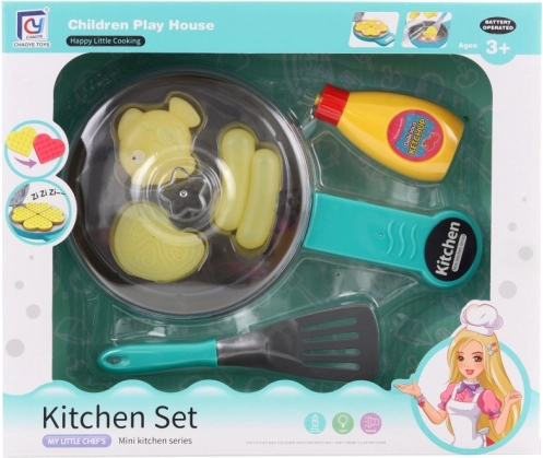 Børnelegesæt – stegepande med effekter: simulerer madlavning, farveskift på madvarer, til børn 3+. Sjov samlet i ét sæt.