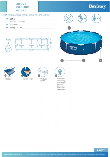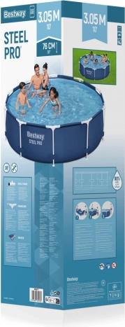 Bestway havepool med en diameter på 306 cm og en højde på 76 cm er et ideelt valg til varme dage. Poolens konstruktion gør det muligt at fylde den op til 90 % med vand, hvilket betyder, at den rummer 4678 liter vand. Den er fremstillet af holdbart trelags PVC, der er modstandsdygtigt over for klor og sollys.