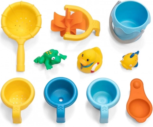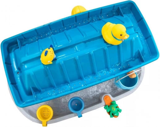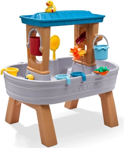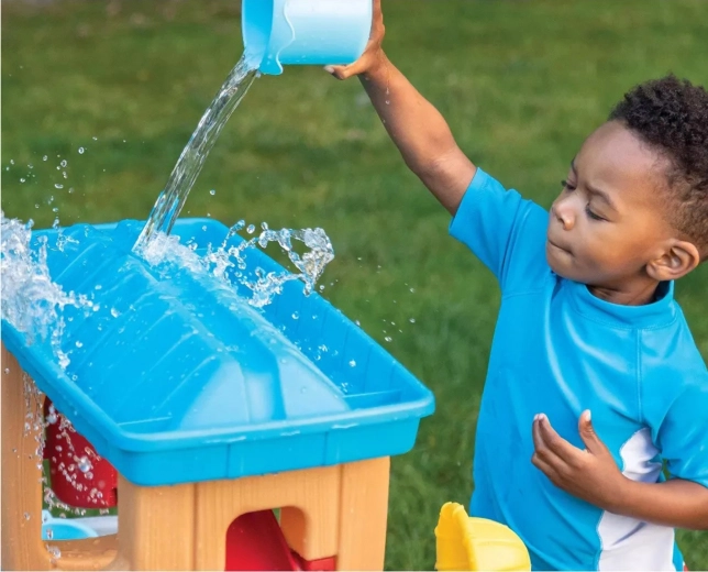 Det børnevenlige vandbord fra Step2 giver alsidig underholdning. Den dobbelte beholder skaber en realistisk regneffekt – hæld blot vand i, så kan legen begynde! Vandet fra den øverste tank udløser en realistisk regneffekt. På den ene side falder vandet ned i en spand, som tipper og hælder vandet ud, når den er fuld, mens vandet på den anden side løber gennem en rende mod et roterende hjul. Sættet inkluderer også en rampe til dyrene, en holder til spanden og en si. Alt ender i et lille bassin i bunden.