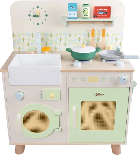 Det stilfulde trækøkken Classic World er det ideelle sted for børns kulinariske eventyr. De naturlige farver, realistiske detaljer og tilbehør gør legen endnu mere fængende og udvikler kreativitet, selvstændighed og finmotorik.