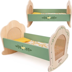 Trævugge til dukker i vintage-stil med naturlige rattan-detaljer! Denne charmerende vugge kombinerer den tidløse charme fra vintage-stilen med skønheden i rattanflet og bliver et fantastisk tilbehør til enhver leg.