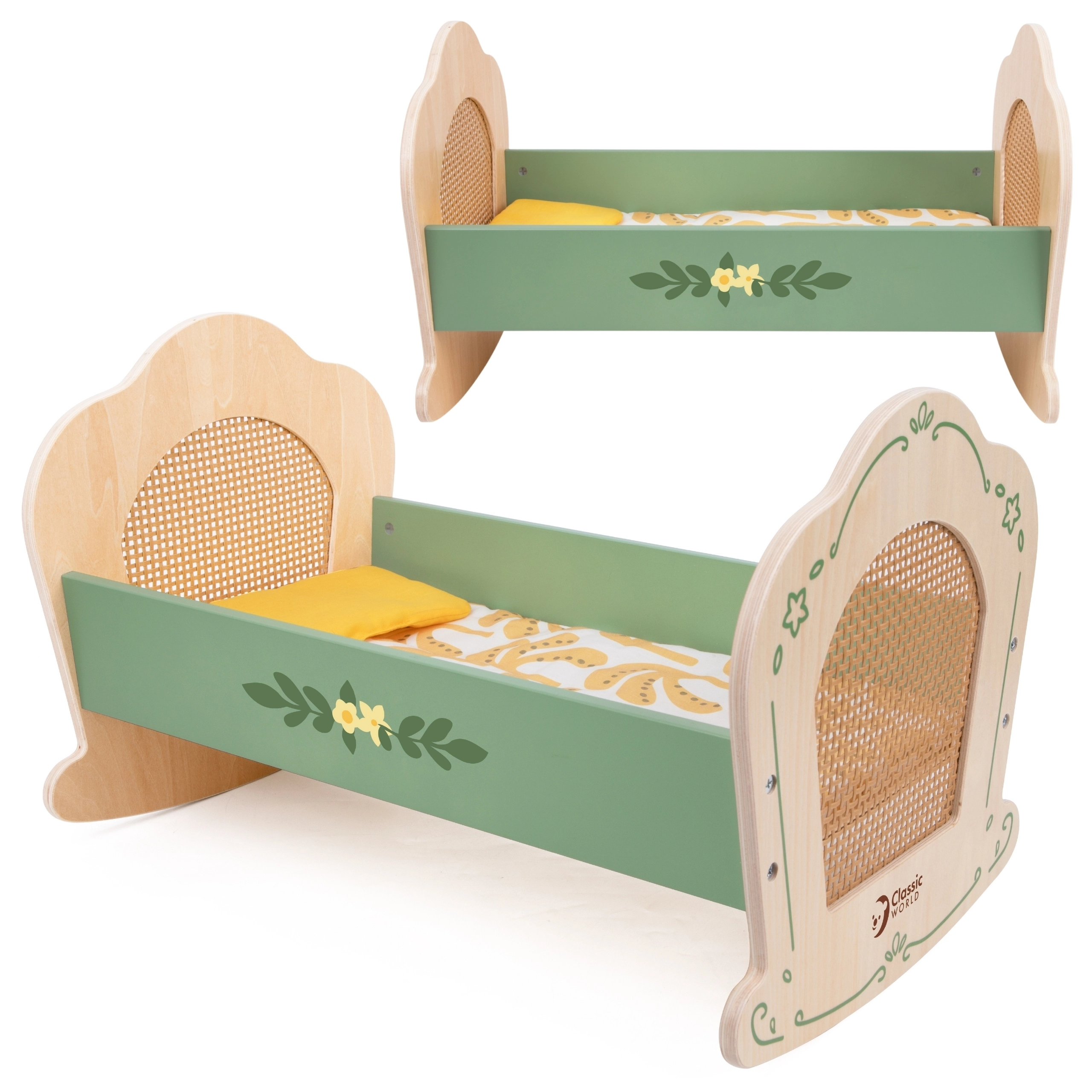 Denne fortryllende vugge i grønne nuancer forener tidløs vintage-charme med den naturlige skønhed fra rattanflet. Klassiske detaljer og dæmpede farver gør vuggen til et perfekt supplement til enhver rolleleg, hvad enten det gælder pasning af dukker eller bamser. Den delikate dekoration giver vuggen en unik karakter, og det bløde sengetøj sikrer dukken en behagelig søvn.