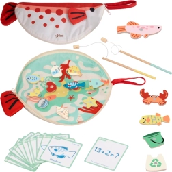 - 2 magnetiske stave, træfisk og genstande til fiskeri, pædagogiske kort, fiskeformet måtte / etui