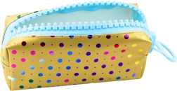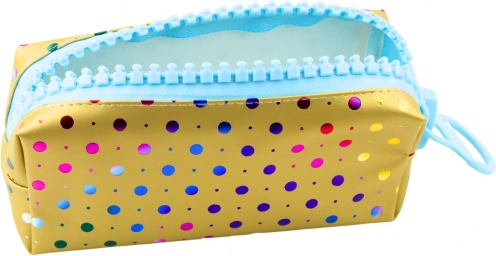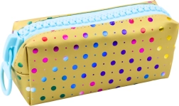 Skolepenalhuset i gylden finish med farvede prikker kombinerer et moderne design med en praktisk løsning til opbevaring af skoleudstyr. Det livlige og muntert afstemte design gør penalhuset attraktivt for børn og unge, som værdsætter original stil.