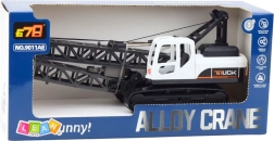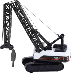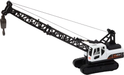 Kranen har en bevægelig arm med krog, der kan hæves og sænkes. Kranarmen bevæger sig på led og den drejelige base giver mulighed for en fuld rotation på 360°. Hele konstruktionen er bygget på en solid bælteundervogn, hvilket øger realisme og stabilitet. Legetøjet er designet i hvid-sort farvetema med detaljer, der efterligner professionelt byggemateriel.