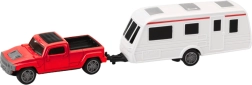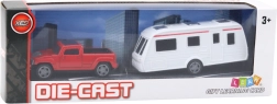 Dette sæt med lille bil og campingvogn er fremstillet med die-cast-teknologi, hvilket betyder, at bilens karrosseri er af metal, og nogle elementer er af holdbar plast. Dette materialevalg sikrer legetøjets holdbarhed og æstetik. Campingvognen kan nemt afkobles fra bilen, hvilket giver børn mulighed for at skabe mange forskellige lege-scenarier – fra ferieture til familieudflugter.