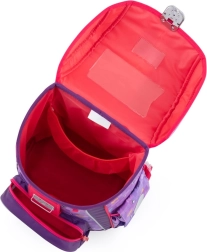 Rygsækken består af ét rummeligt kammer, der nemt rummer alle skoleartikler. Bunden er fremstillet af et robust materiale for at beskytte indholdet. Lukningen sker med et sikkert metalspænde med refleks. Den forreste lomme er beregnet til madpakke, og der mangler ikke reflekterende elementer, som sikrer synlighed.