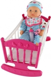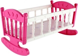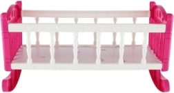 Pink og hvid vugge med delikate dekorationer er lavet af holdbar plast, der tillader at rokke og berolige dukken. Ideel til udvikling af fantasi under leg.