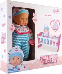 Vi præsenterer denne gang en unik dukke med vugge, som vil være en fantastisk tilføjelse til ethvert barns legeunivers. Dukkens bløde krop muliggør nem håndtering og bæring, hvilket giver bevægelserne i legen en realistisk touch. Den lyserøde vugge med hvide striber og hjertemotiv er ideel til at berolige dukken, mens tilbehør som flaske og sut giver en realistisk oplevelse af babyomsorg.