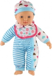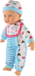 Dukken er iført blåt og hvidstribet tøj med søde hjerter. Den er udstyret med en sut og flaske, hvilket tilføjer en realistisk element til legen.