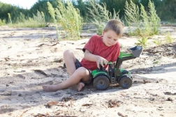 Denne detaljerede traktor med trailer er ideel til leg i sandkasse, have og derhjemme. Den funktionelle frontlæsser gør det let at samle sand eller småmateriale, og traileren med tipkasse sørger for nem transport og aflæsning af lasten. Store, mønstrede hjul og 6 mm metalaksler giver stabilitet og holdbarhed selv ved intensiv leg.