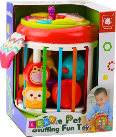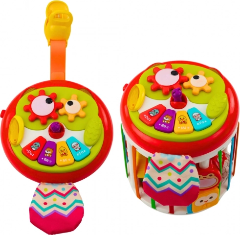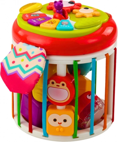 På den øverste del af terningen findes et musikpanel med knapper, der udsender lyde og dyreikoner. Disse lyde fanger straks barnets opmærksomhed og hjælper det med at forstå årsag og virkning. Andre interessante elementer omfatter farvede tandhjul til leg, et lille spejl og en blød åbning til indsættelse af klodser.