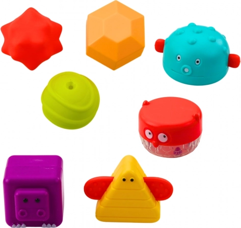 Legetøjet indeholder 7 forskellige klodser med mål på cirka 4–6 cm, som har forskellige fremspring, teksturer eller dyregrafik. Hver klods har en anden form og farve, hvilket understøtter visuel og kognitiv perception.